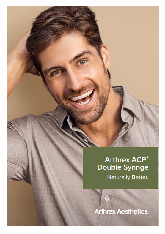 The Arthrex ACP double syringe is used for the preparation of fluid PRF from the patient’s own blood. When injected into the treatment area, this fluid PRF stimulates the body’s own hyaluronic acid and collagen synthesis, cell proliferation, and regeneration. Studies show its clinical effectiveness for skin rejuvenation, wound treatment, scar reduction, hair restoration, and more.5
